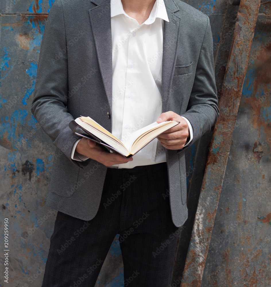 A Young Writer In A Fashionable Outfit With An Open Book Posing Against The Wall For Advertising Outdoor Stock Photo Adobe Stock